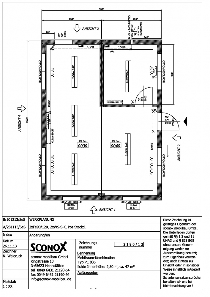 Medien- und Kabeleinführung bauseits durch Wand via WD 50/120 mm (+2360…2460mm OKFF = Öffnung), Position siehe Zeichnung. Kabelführung von Container zu Container im Kabelkanal 170/65 unter Decke.