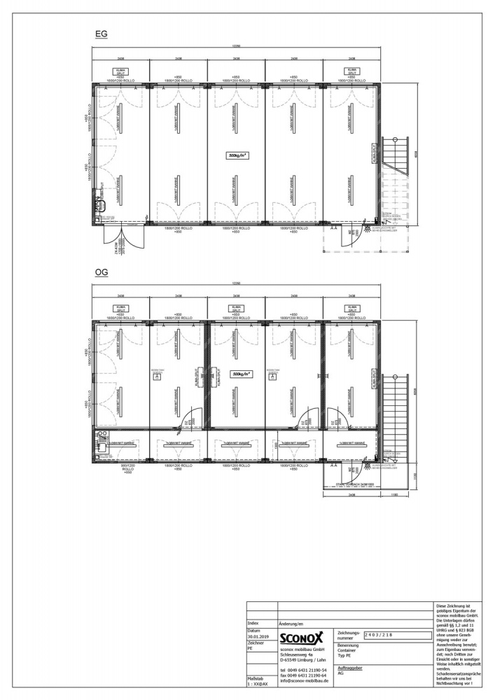 Dachentwässerung erfolgt je Containermodul über vier PVC-Fallrohre (NW 60 mm Außendurchmesser 63mm), die in den Ecksäulen nicht sichtbar verlegt sind. Diese sind an einer Kastenrinne angeschlossen welche in den beiden stirnseitigen Dachrahmen der Container integriert ist. Anschluss an Kanalnetz kundenseitig.
