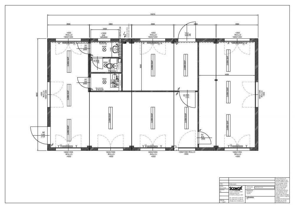 Dachentwässerung erfolgt je Containermodul über vier PVC-Fallrohre (NW 60 mm Außendurchmesser 63mm), die in den Ecksäulen nicht sichtbar verlegt sind. Diese sind an einer Kastenrinne angeschlossen welche in den beiden stirnseitigen Dachrahmen der Container integriert ist. Anschluss an Kanalnetz kundenseitig.