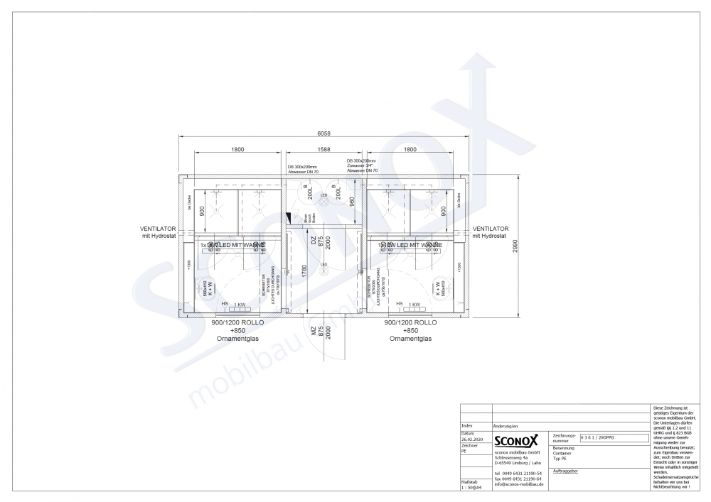 Dachentwässerung erfolgt je Containermodul über vier PVC-Fallrohre (NW 60 mm Außendurchmesser 63mm), die in den Ecksäulen nicht sichtbar verlegt sind. Diese sind an einer Kastenrinne angeschlossen welche in den beiden stirnseitigen Dachrahmen der Container integriert ist. Anschluss an Kanalnetz kundenseitig.