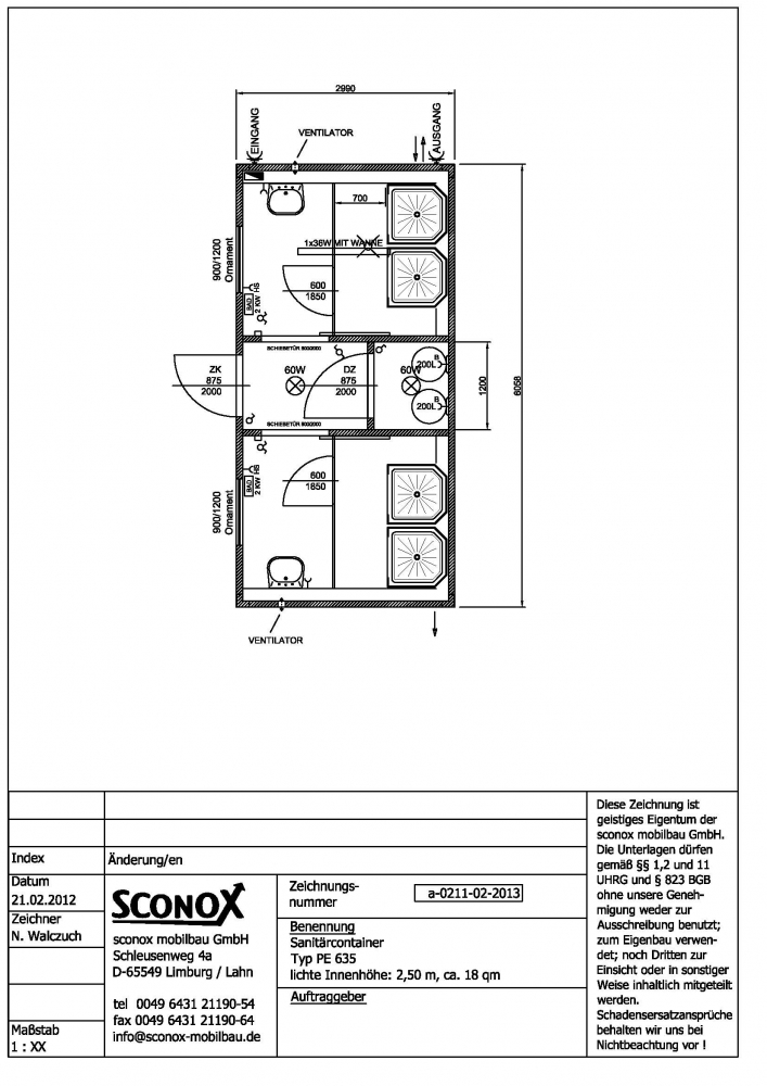 Dachentwässerung erfolgt über vier in den Eckstielen untergebrachte PVC- Fallrohre NW 60 mm, die auf einen in den oberen Containerkästen eingebrachten Rohrstutzen aufgebracht sind.