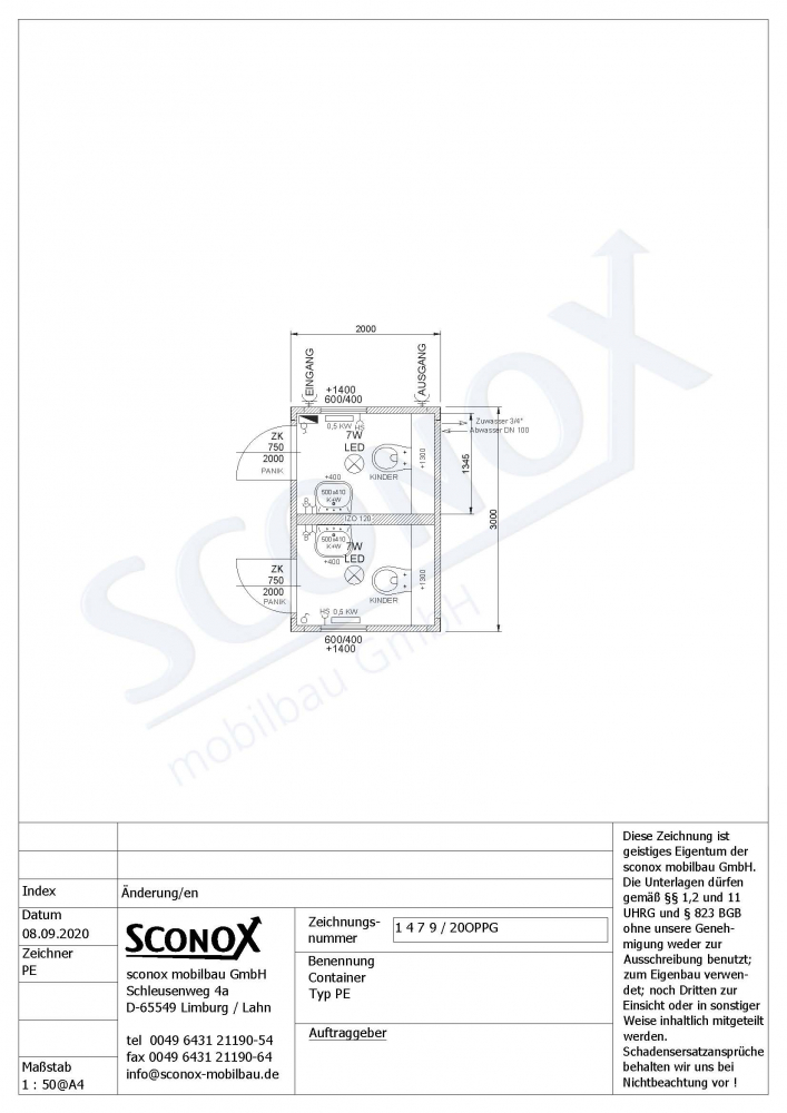 Dachentwässerung erfolgt je Containermodul über vier PVC-Fallrohre (NW 60 mm Außendurchmesser 63mm), die in den Ecksäulen nicht sichtbar verlegt sind. Diese sind an einer Kastenrinne angeschlossen welche in den beiden stirnseitigen Dachrahmen der Container integriert ist. Anschluss an Kanalnetz kundenseitig.