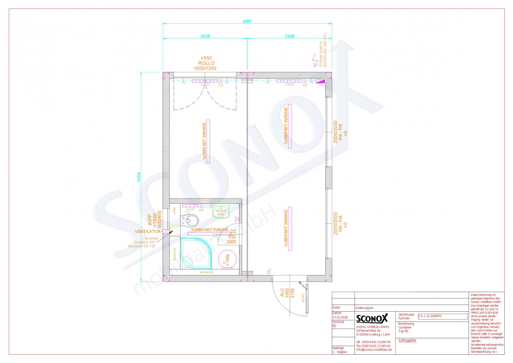 Kabeleinführung bauseits durch Boden , (bauseitiger Festanschluss, keine hässlichen Außenstecker, Verschließen und Abdichten der Bodenöffnung bauseits), vertikaler Kabelkanal bis zum Verteilerkasten Kabelführung von Container zu Container im Kabelkanal unter Decke.